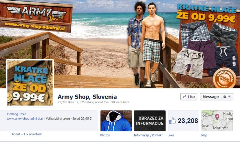 Splošni vtis: ne vem ali je odlična ocena tu zato, ker je ocenjevalec rojen vojaški fan, a dejstvo je da je FB stran Army Shopa Admiral dokaz, da se s pravo komunikacijo na Facebook da narediti veliko, če imate pravo strategijo in definirane cilje in ciljno publiko. Morda so včasih besedila pri objavah preveč na prvo žogo s pozivanjem k interakcijam, morda bi veljalo vsebine še nekoliko razširiti, a gledano na splošno je to ena odlična stran.