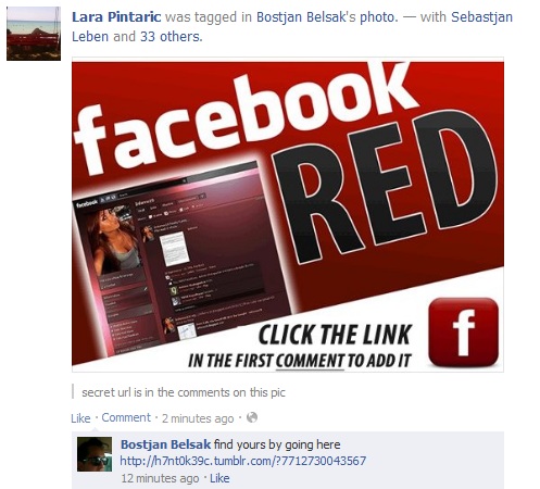 Upam, da tega zapis ne boste rabili, ker ne klikate vsepovprek in niste tako radovedno naivne sorte, da bi verjeli v obstoj rdeče (ali kakršnekoli druge) barve Facebooka. Ta je in bo ostal moder. Vse ostale inačice so scam, nevarne aplikacije, ki se viralno širijo po omrežjih in lovijo naivne duše, ter jih prepričujejo, da bodo dobili iPhone5, samo vpisati morate svojo telefonsko številko.