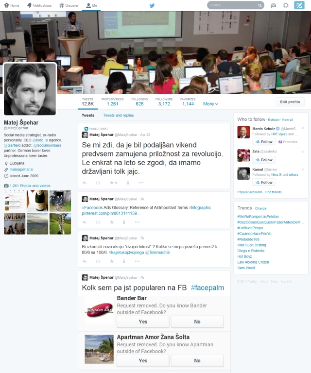 Mimogrede, skoraj sem že pozabil kdaj sem pristal na Twitterju. Bilo je junija 2009, torej bom v kratkem praznoval že 5 let tvitanja. Hvala vsem 3172 sledilcem, ki me še vedno niste odsledili.
